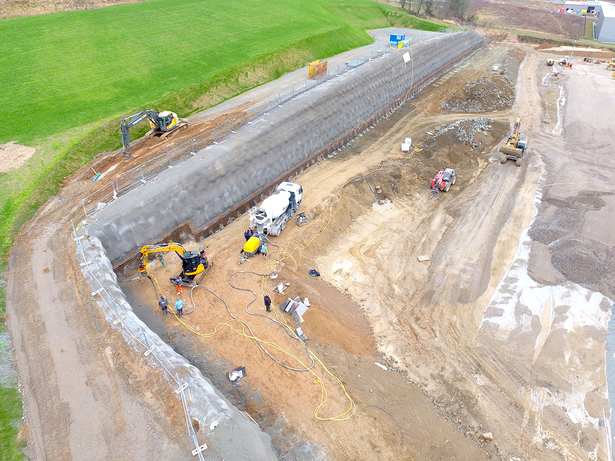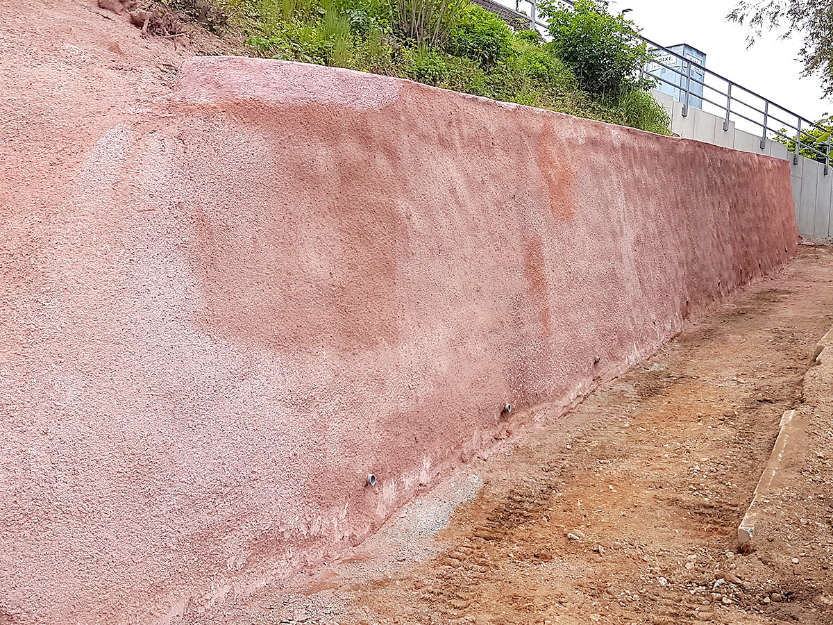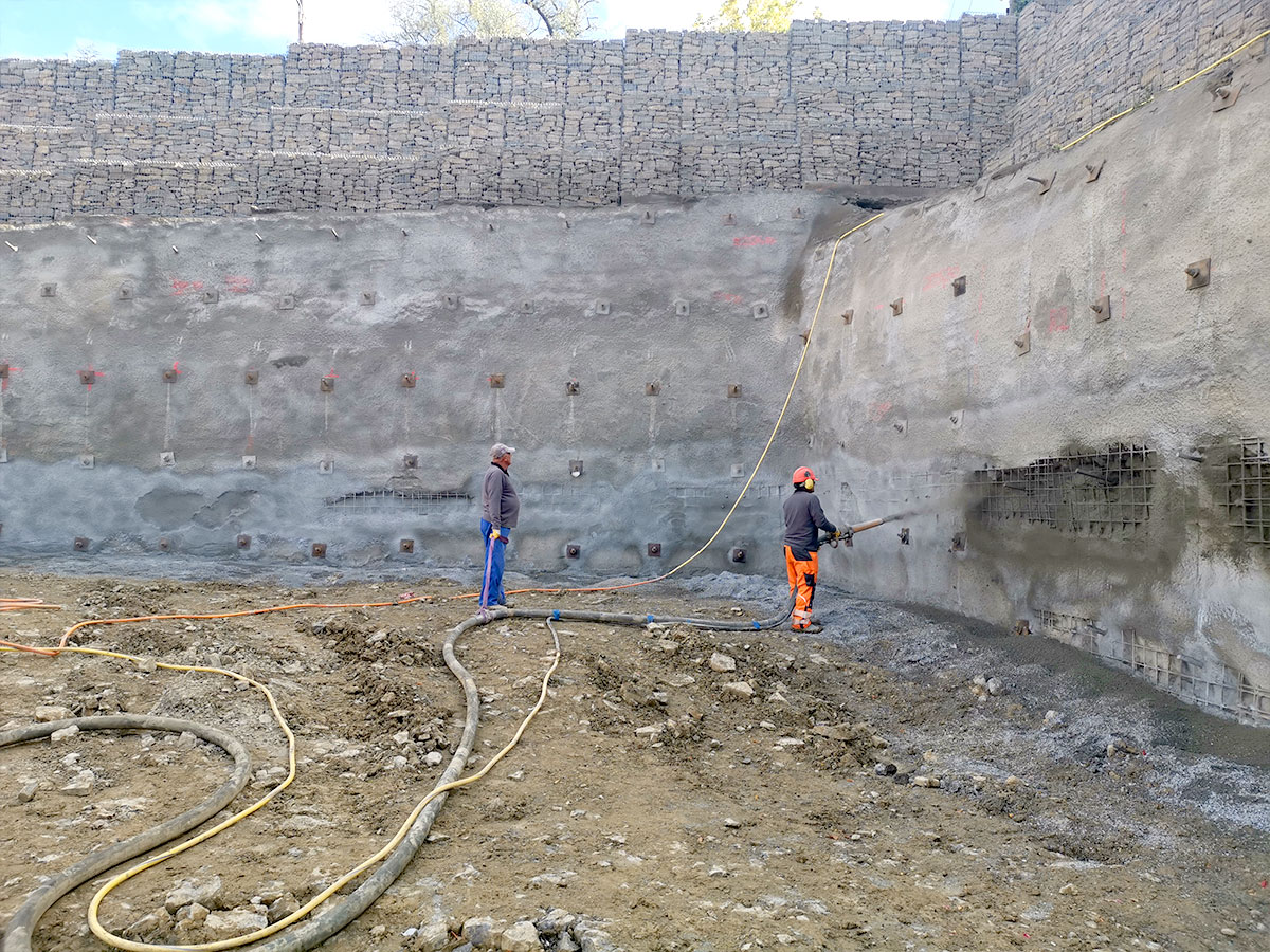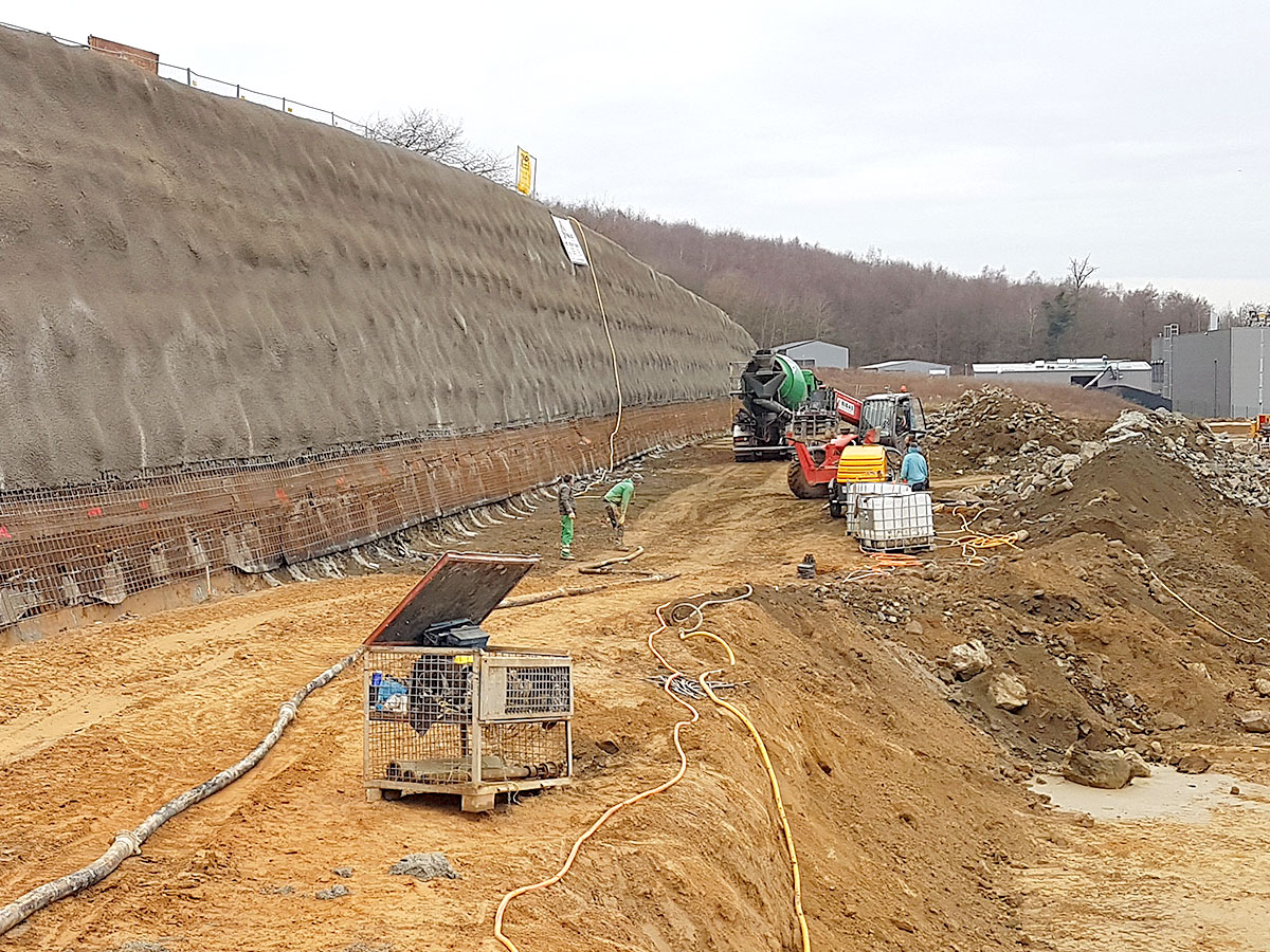 Schnelles und flexibles Verfahrung zum Sichern von z.B. Baugruben, Schächten oder Hängen. Hierbei muss das zu sichernde Objekt abhängig von Bodenbeschaffenheit und Neigung meist zusätzlich bewehrt und ggfs. rückverankert werden. Die Verbau- und Sicherungsarbeiten können je nach Geologie und Böschungsneigung in einem Stück oder abschnittsweise im Wechselspiel mit den Aushubarbeiten erfolgen. Durch große Flächen und Schichtstärken ist eine hohe Einbauleistung gefordert, um den Stillstand der Erdbaugeräte so kurz wie möglich zu halten. Je nach Erfordernis können dem Spritzbeton als Bewehrung auch Stahlfasern zugegeben werden.